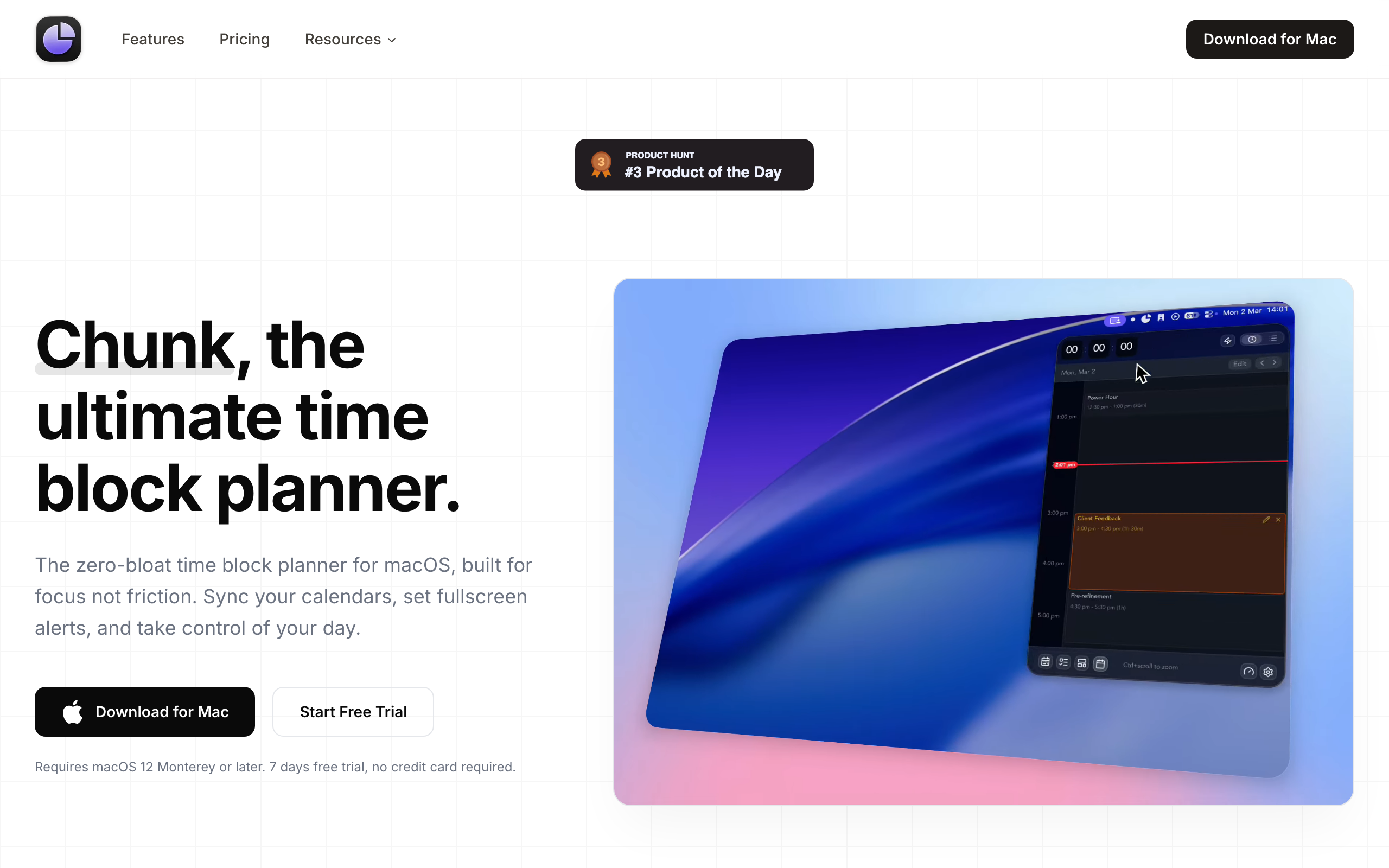 VisitThe ultimate time block planner for macOS. Plan your day in focused chunks from the menubar, get fullscreen alerts when time is up, sync with Apple/Google/Outlook calendars, and even let Claude AI organize your schedule.