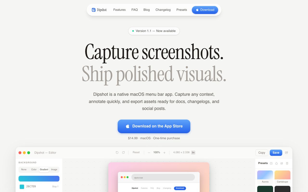 VisitA lightweight macOS menu bar app for capturing and annotating screenshots. Add arrows, text, shapes, and callouts, then export clean polished visuals without breaking your flow. Built by a solo maker.